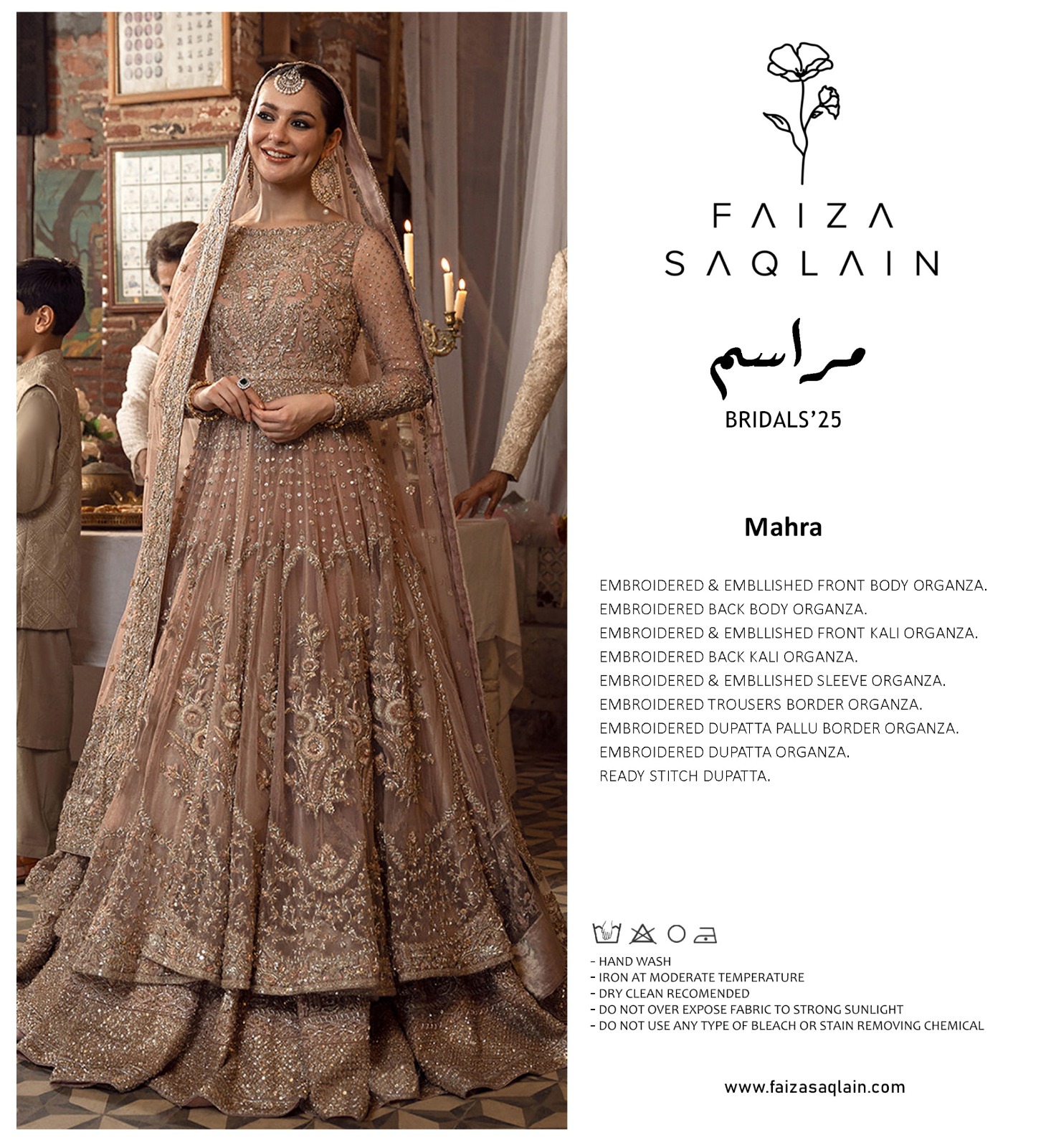 Peach pink bridal set exquisitely rendered and delicately handworked using dabka, resham, tilla and other traditional hand techniques.